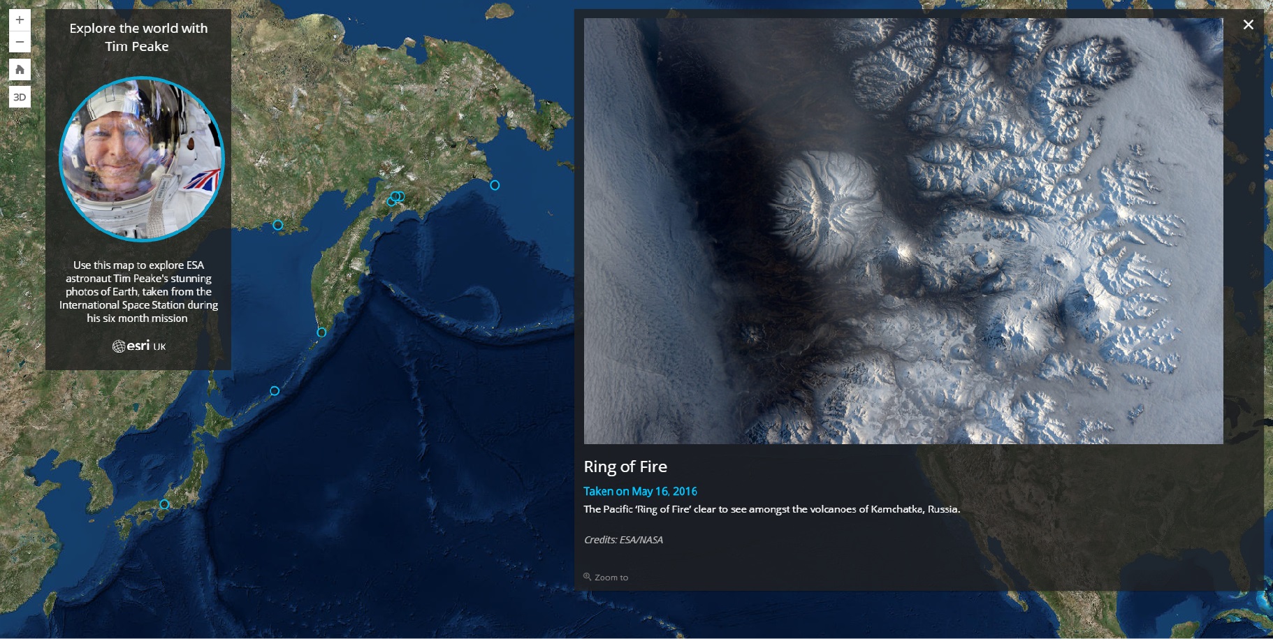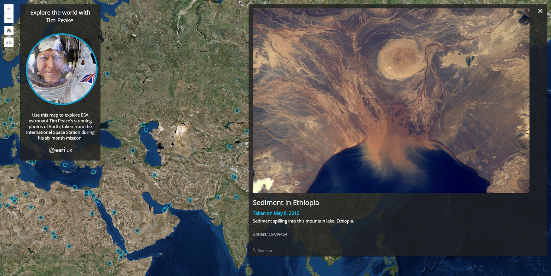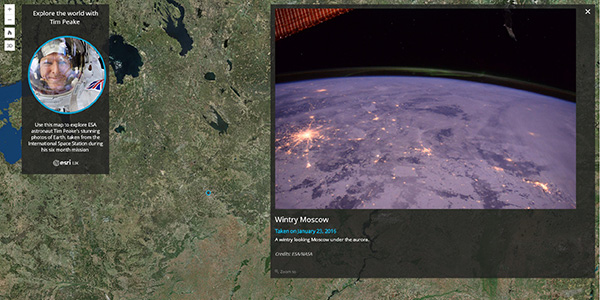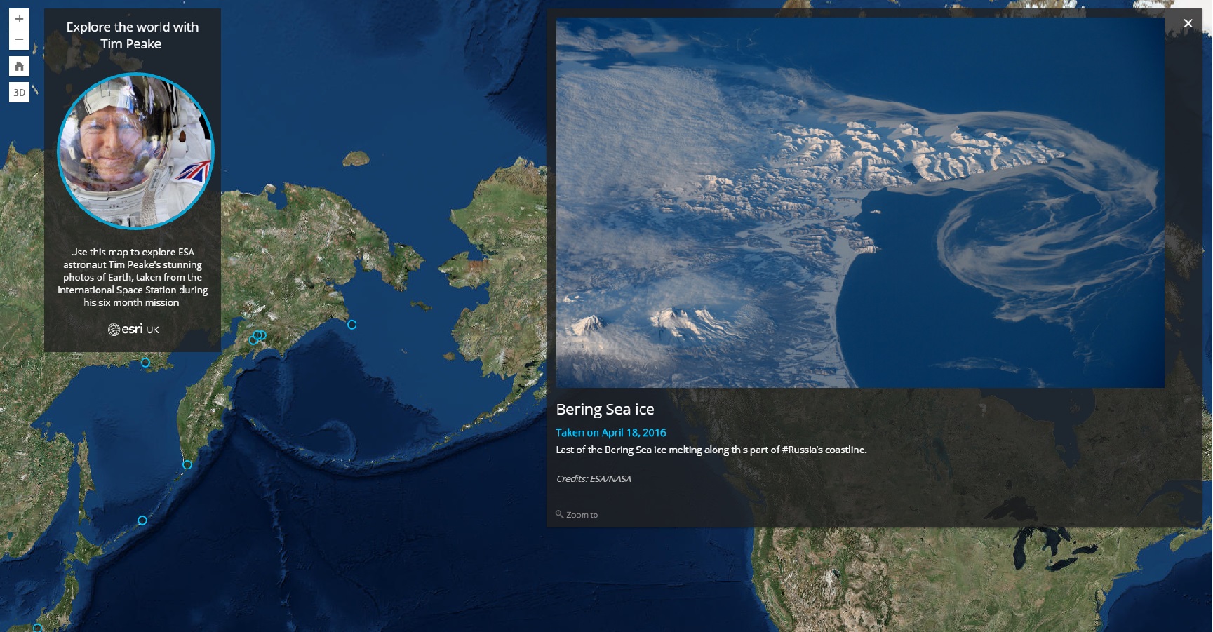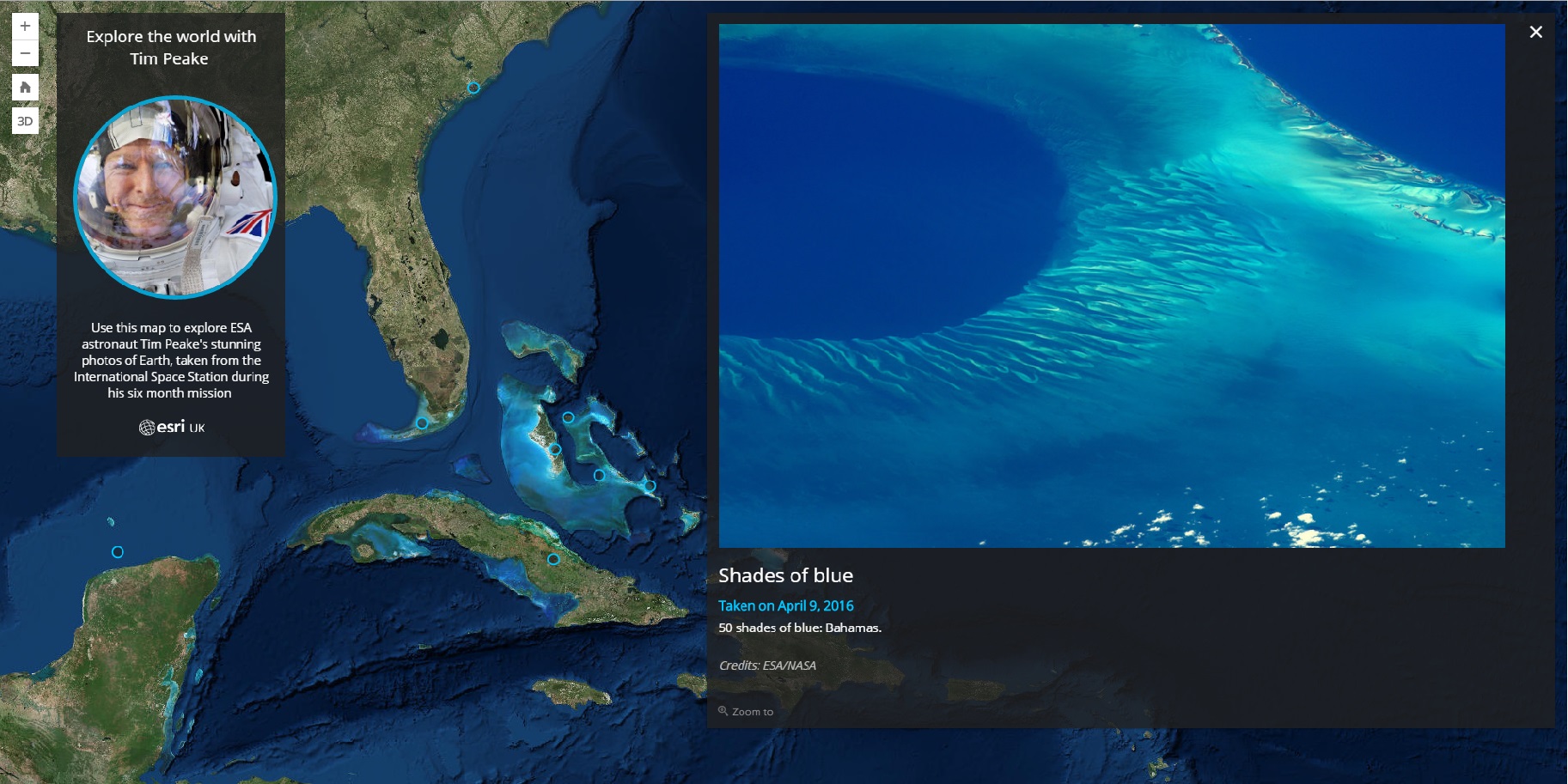英国の宇宙飛行士 ティム・ピー氏が6ヶ月に及ぶ宇宙滞在期間中に国際宇宙ステーションから撮影した美しい写真を、Esri UK社がストーリーマップに仕上げました。