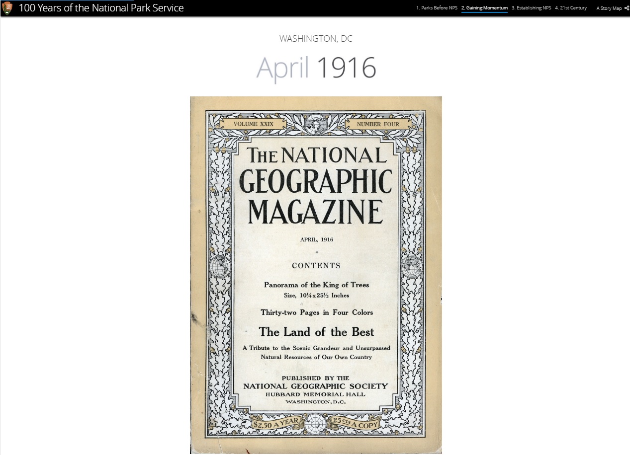 1916年ナショナルジオグラフィック誌は、国土の自然の素晴らしさにフォーカスをあて、全面を祝福モードで仕上げた4月号を出版し、国立公園局の設立に向けた最後の勢いに寄与しました。