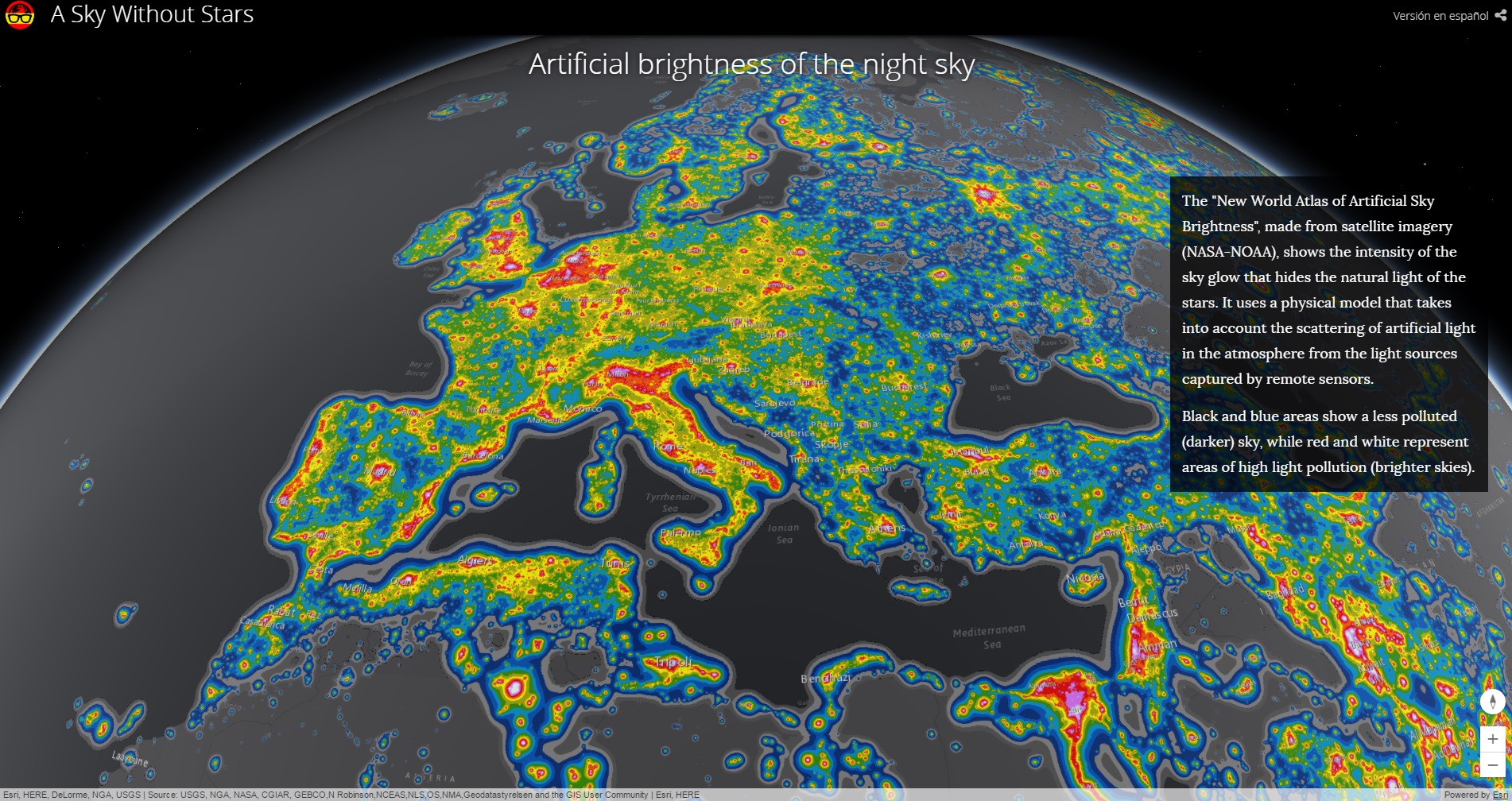 衛星画像(NASA-NOAA)から作られたこの地図は、星の自然光を隠す光の輝きの強度を示しています。リモート・センサーから取得した光源をベースに、人工光を散乱する大気を考慮し、モデリングされています。赤-白は、光害が深刻なエリアを示し、黒-青はそれほど光害の影響が少ないエリアを示しています。この地図で日本を見てみると、東京・大阪・名古屋を中心に光害の影響が強いことが分かります。