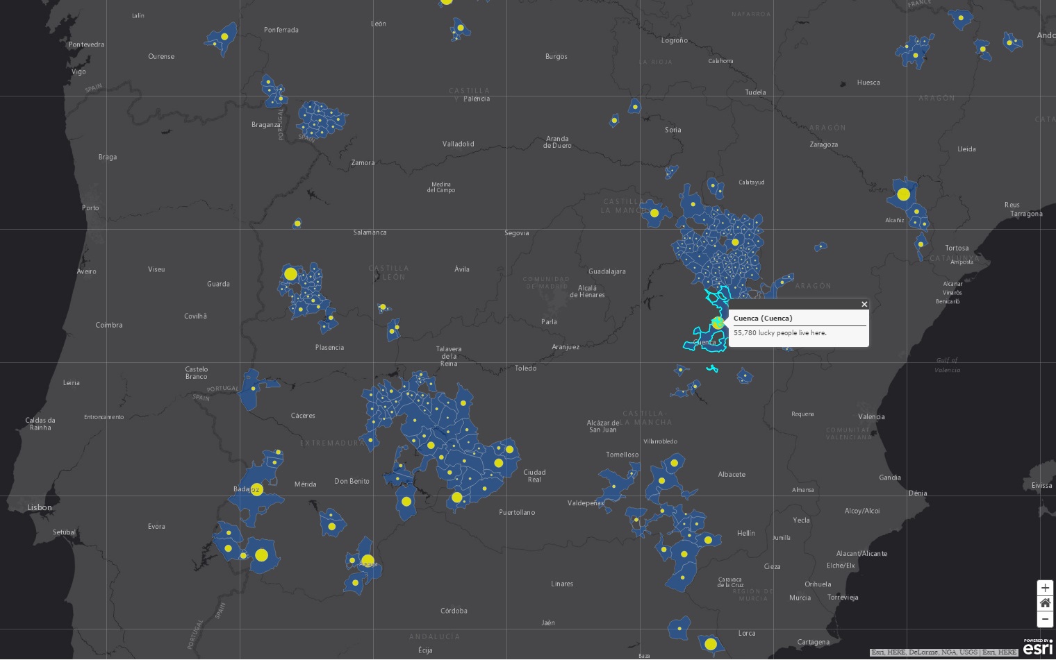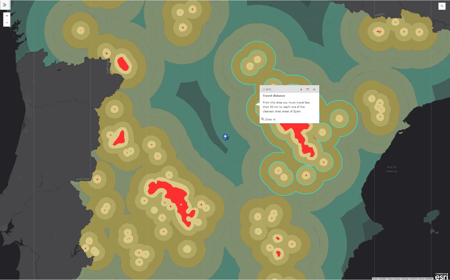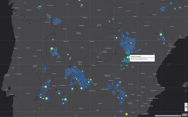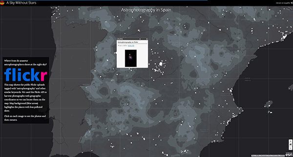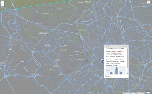 検索バーを使って、自分の住む町の光害状況を確認できます。次の地図では、自分の住む場所をクリックすると、天文観測ができるエリアまでどのくらい離れているのかを知ることができます。マドリードの場合、天文観測ができる場所にいくには150kmも移動しなければなりません。