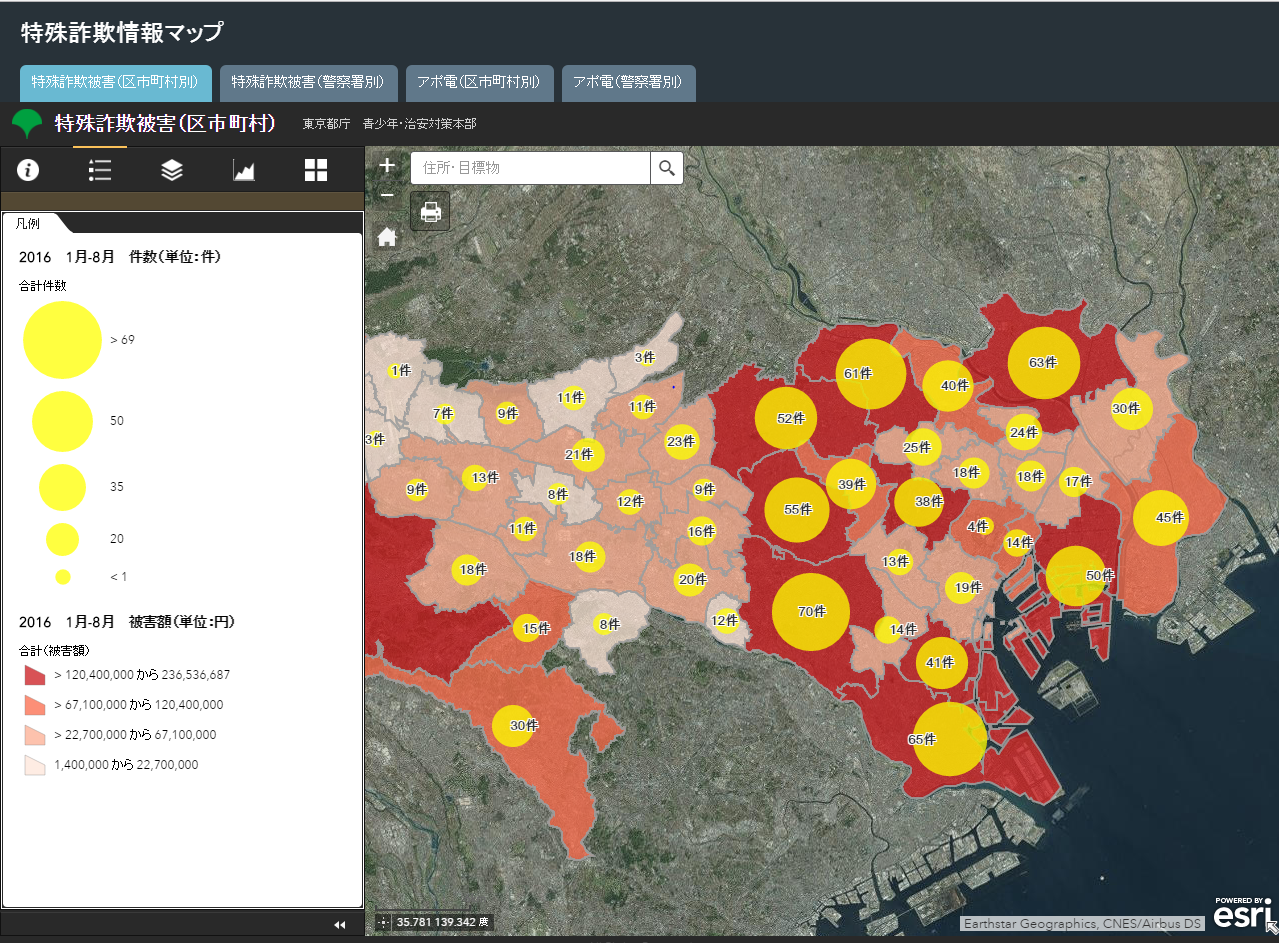 東京都内での特殊詐欺の被害情報などが可視化されています。