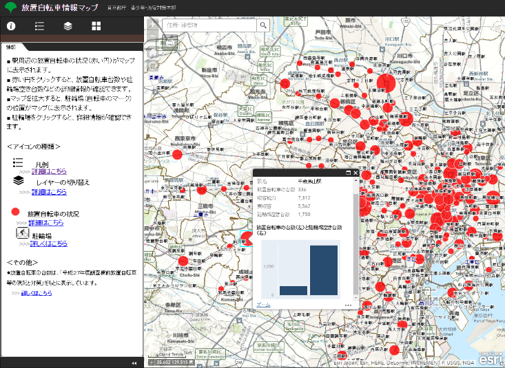 都内各鉄道駅周辺での放置自転車の台数がわかりやすく可視化されているほか、駅ごとの駐輪場の収容台数なども公開されています。