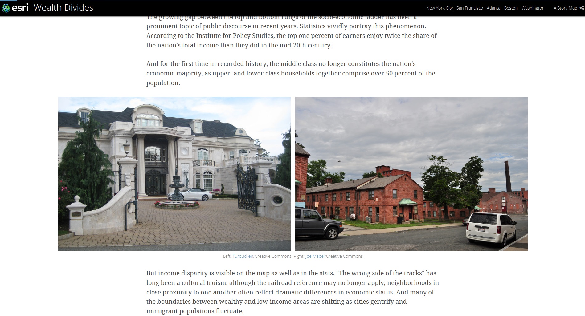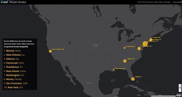 所得格差は、統計上だけではなく、地図上で見ても明らかです。貧しい地区を表す言い回しに、” The wrong side of the tracks(鉄道を挟んだ向こう側の町)”という言い回しがあります。貧困地区がしばし鉄道の線路によって隔たれていることから来ている表現ですが、今日、この例えが当てはまらないほど、富裕層と低所得地域の境界は近接しています。都市の高騰化が進み、流入する移民の人口が変動するにつれ、このコミュニティ格差の境界にも変化がうまれつつあります。