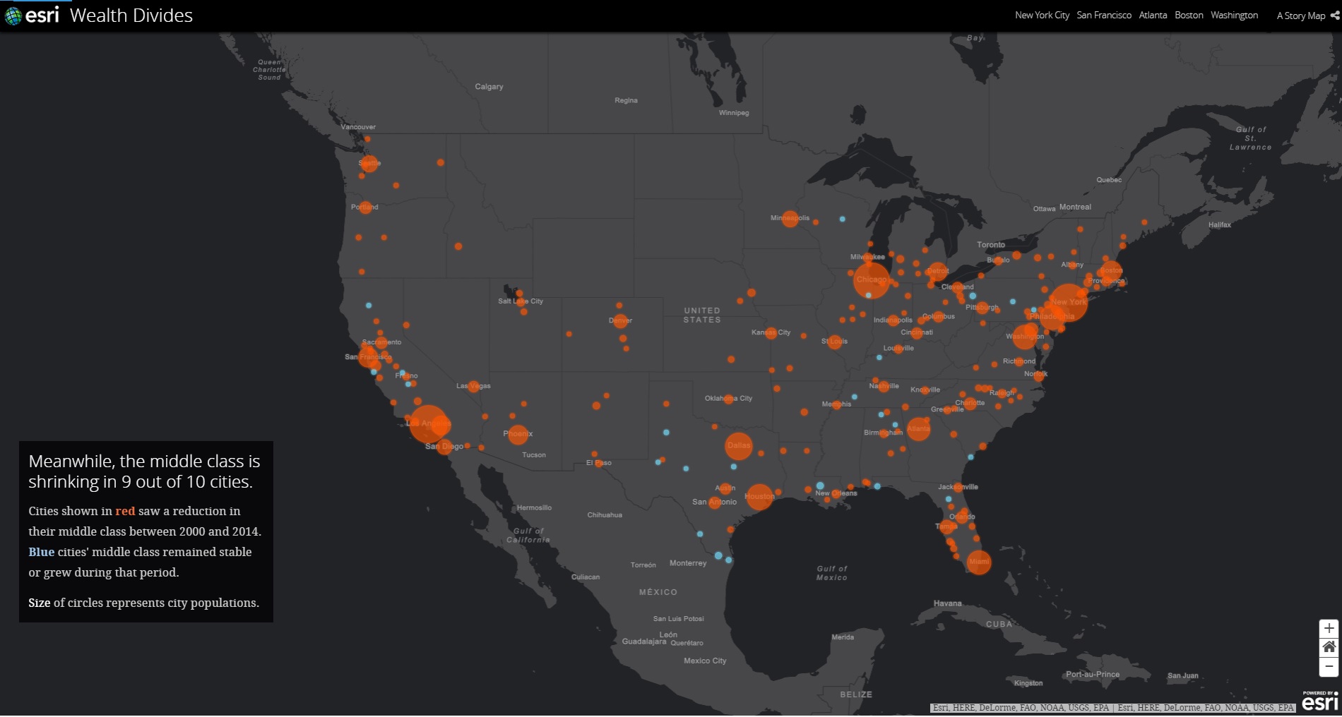 赤は、中産階級が減少した都市、青色は中産階級の数が増加、もしくは特に変化がなかった都市を示しています。