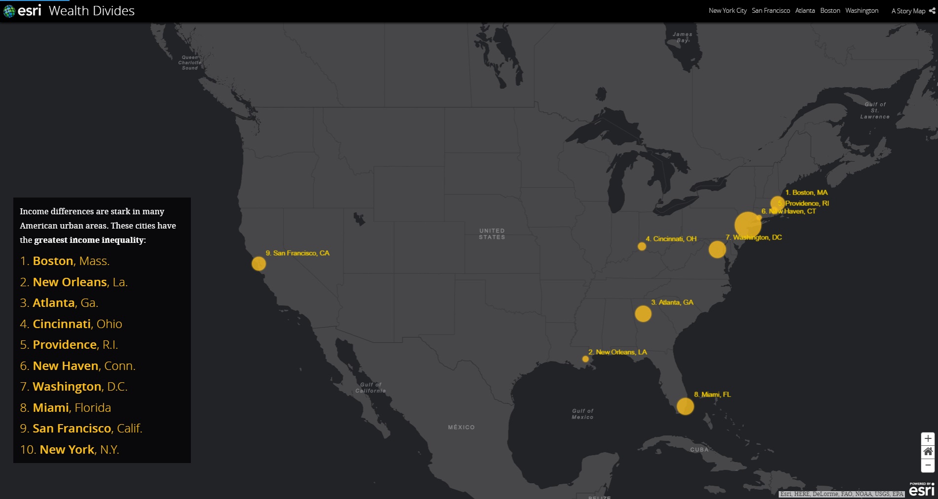 都市部では所得格差が特に際立って見えます。次のマップは、所得格差が大きい10の都市を示しています。円の大きさは人口数を表し、1-10の順位は、所得格差の大きいランクを示しています。