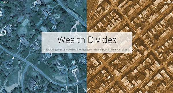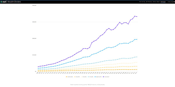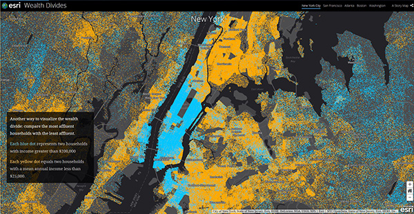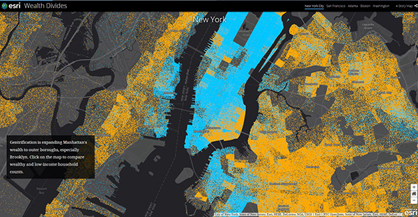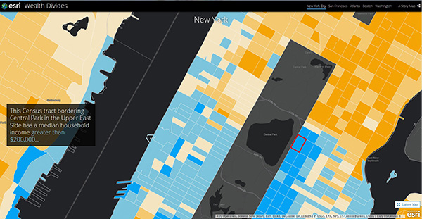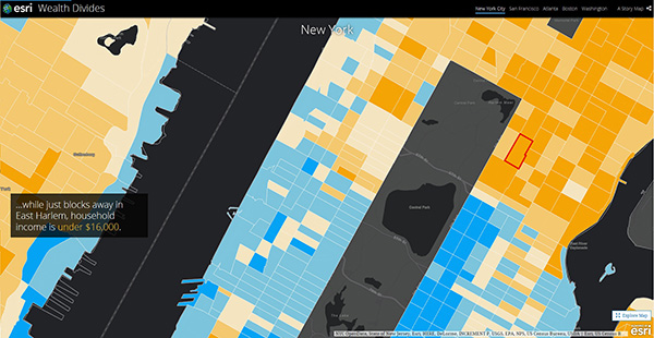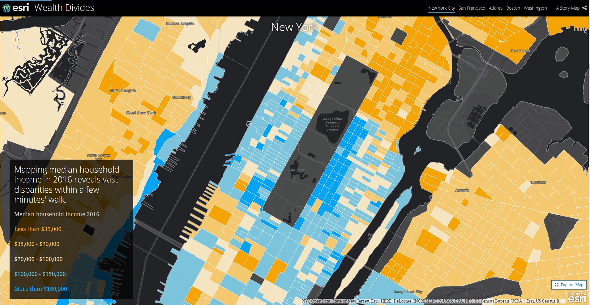 この地図は、2016年平均年間世帯所得の値をマッピングしたものです。大幅な格差の世帯が徒歩数分の圏内に近接しているのが分かります。
