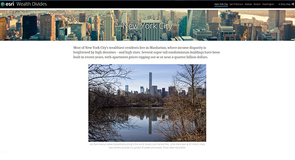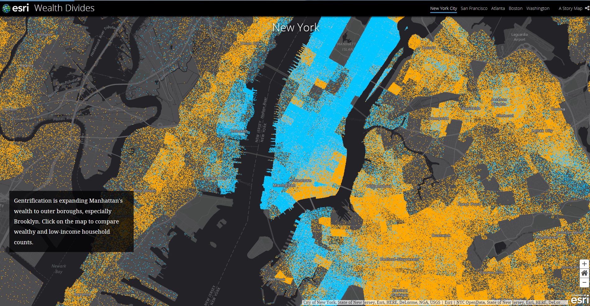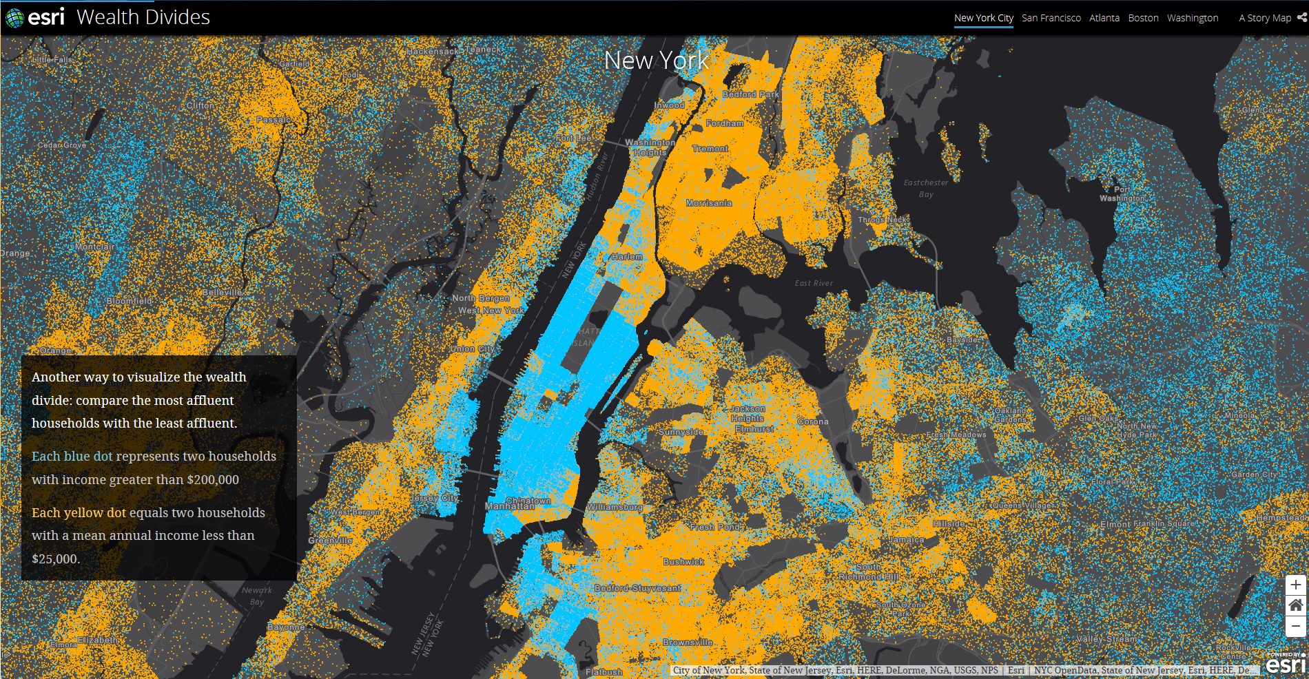 高所得者エリアは郊外にも広がりつつあります。マンハッタンの富は、特にブルックリンの外側の地域に広がりを見せているのがよくわかります。それぞれの世帯収入データを比較するには、地図をクリックしてくだい。