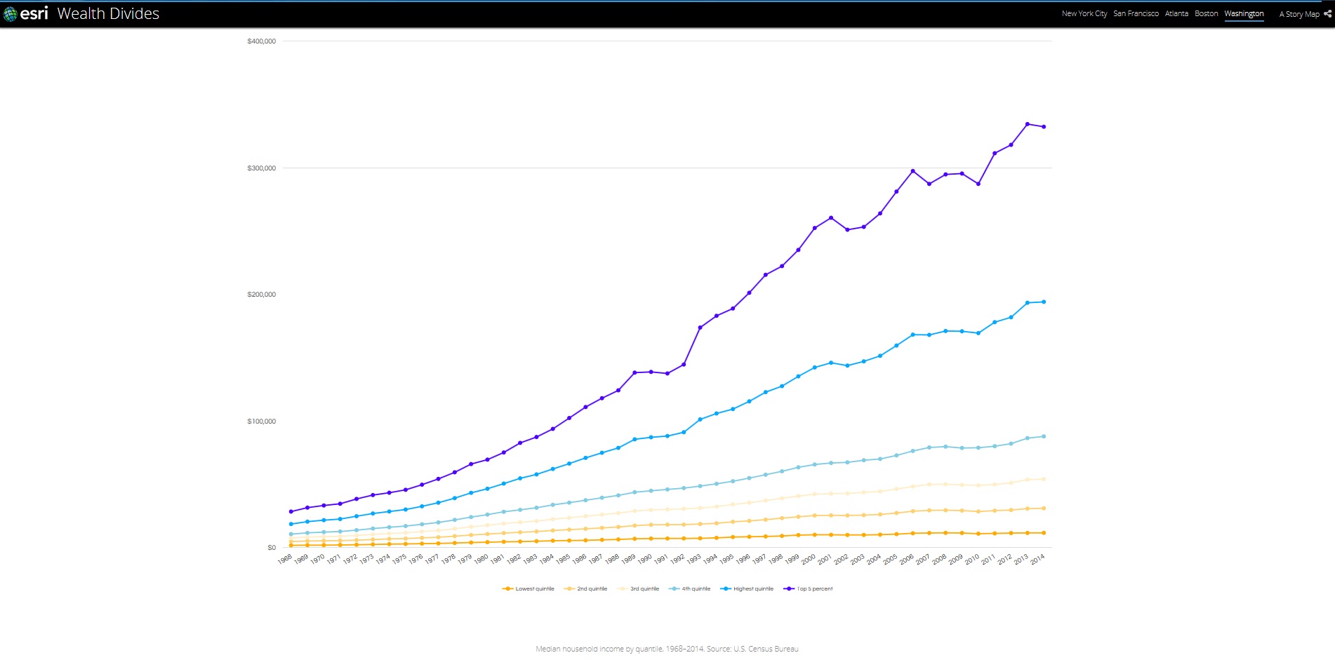 このグラフは、世帯収入の額ごとに6つのグループに分け、各グループの所得額の変化を見ています。グラフが示すように、トップの上層階級の収入額が他のグループの収入額よりも急激に増加していることが分かります。米国の富はますますこの上層階級グループへと集中していく傾向にあります。