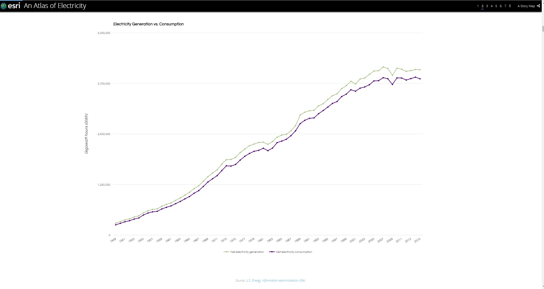 アメリカがこのような電力消費の習慣を維持できるのは、国内で生産された電気によって電力需要が賄えてしまうからです。要するに、消費する電力よりも多くの電力を国内で生産することができるのです。このグラフは、電力消費量と生産量の推移を示しています。電力は大量に貯蓄することができないため、この電力需要と供給ラインはほぼ違いなく推移しています。結果、電気の需要は慎重にバランスを取らなければなりません。この均衡が崩れた時、それは壊滅的な停電が発生した時と言ってよいでしょう。