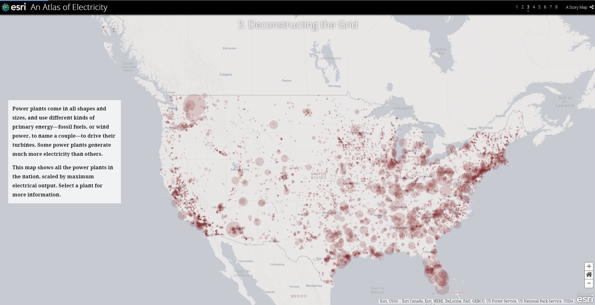 発電所の規模・種類はさまざまで、化石燃料や風力発電といった異なる種類の一次エネルギーを燃料としタービンを回転させます。いくつかの発電所は他の発電所よりも多くの電力を生成します。この地図は、米国すべての発電所をそれぞれの発電量ごとに円の大きさを変えて表示しています。