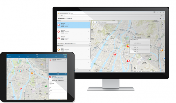 被害調査(電力)テンプレートは ArcGIS Online、Collector for ArcGIS および Operations Dashboard for ArcGIS を利用する現地調査および状態監視ソリューションのテンプレートです。設定が完了すると、現場作業員はスマートフォンやタブレットなどのモバイル端末上の Collector for ArcGIS アプリを使用して Web マップへアクセスし、情報を動的に入力することができます。また事前に作業範囲をモバイル端末にダウンロードすることによって、現場がインターネットに接続できない環境でも損傷情報を収集し、あとからクラウド上のデータと同期することができます。さらにオフィス内のマネージャーや他のスタッフは Operations Dashboard for ArcGIS アプリを使用して、現場作業員が収集した情報をリアルタイムに状態監視し、効率的に作業指示を送ることができます。