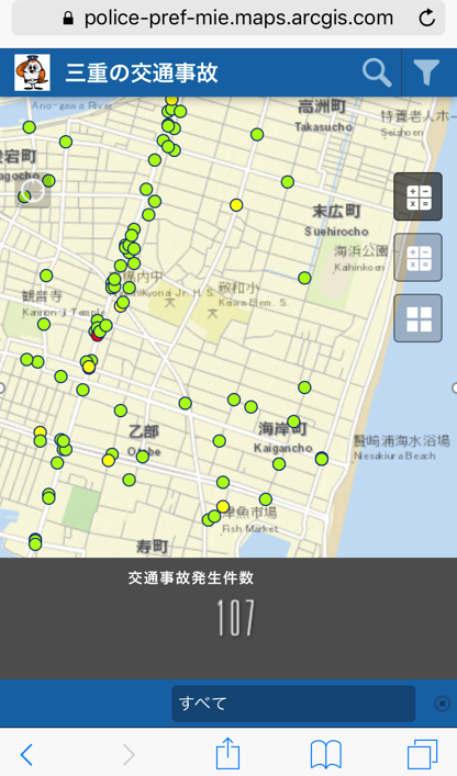 スマートフォンで交通事故発生状況を閲覧するためのマップです。 背景地図は[衛星画像][道路地図]を選択して表示することができます。