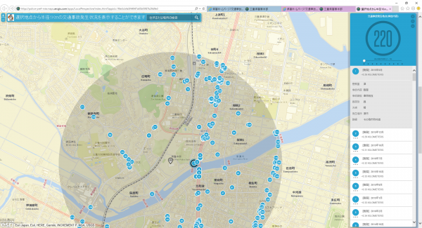 選択地点を中心に半径 1Km 以内(最大 10Km 以内)の交通事故発生状況を素早く表示することができます。