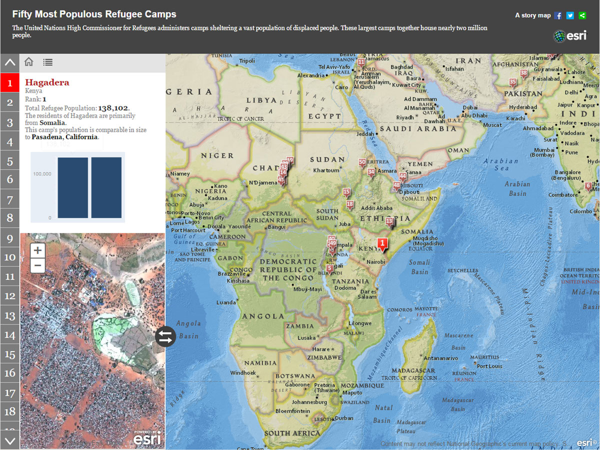 世界で起こっている紛争の爪あとは、多くの難民キャンプとして世界中に点在しています。国連難民高等弁務官事務所によって選ばれた世界でも規模の大きい50もの難民キャンプを米国Esri社が地図にまとめました。