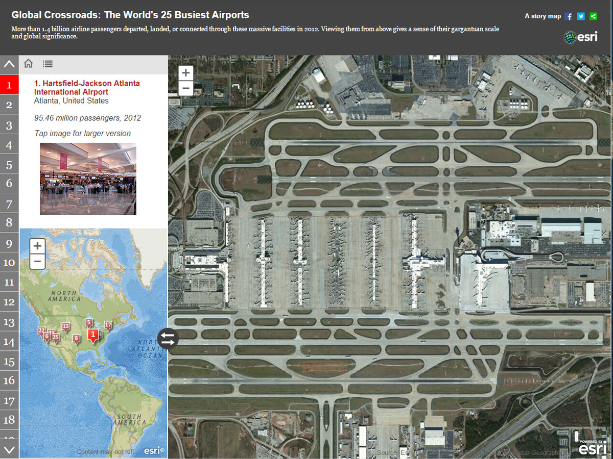 航空写真で見る!「世界の空港 旅客数・利用客ランキングTOP25」 2012年度のデータをもとに世界中で利用客が多かった上位25の空港をランキング形式で紹介しています。米国Esri社が作成。