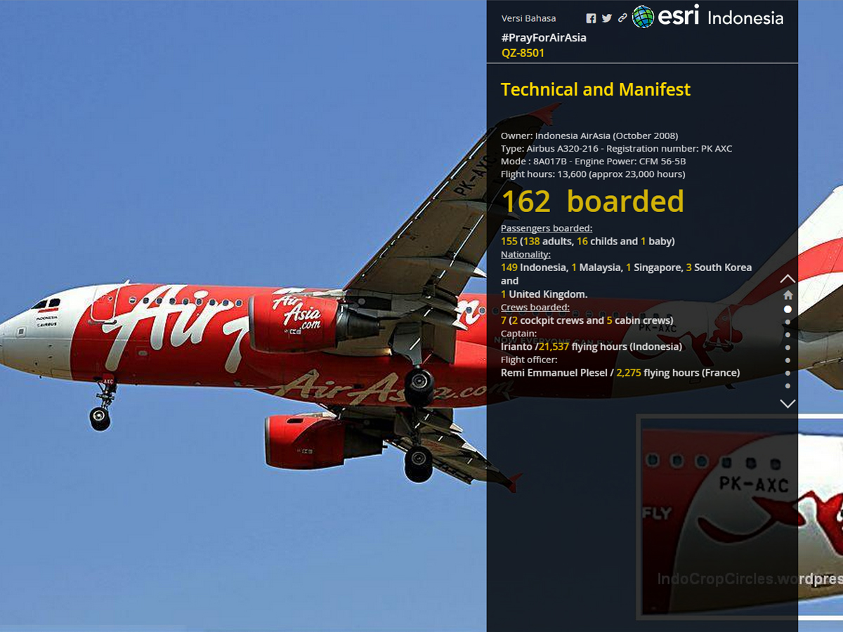 2014年12月28日にインドネシア沖で消息を絶ったエアアジアQZ8501便。Esriインドネシアでは事故直後に「Pray For AirAsia QZ8501」と題したマップジャーナルを作成。当時の天候状況やその後の捜...
