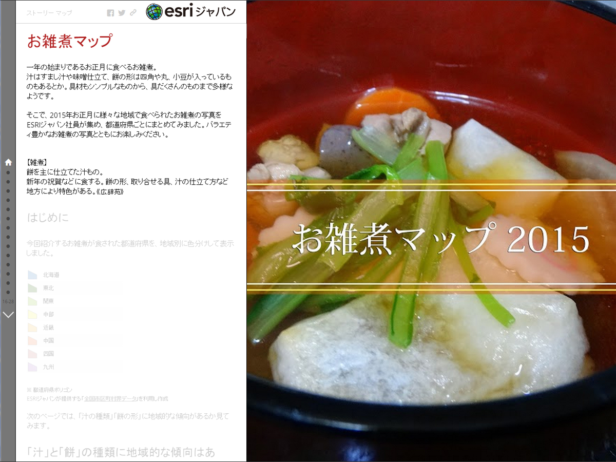 ESRIジャパン社員が2015年お正月に集めたお雑煮をもとに、地域的な傾向を地図上に表現してみました。バラエティ豊かなお雑煮の写真と共にお楽しみください。