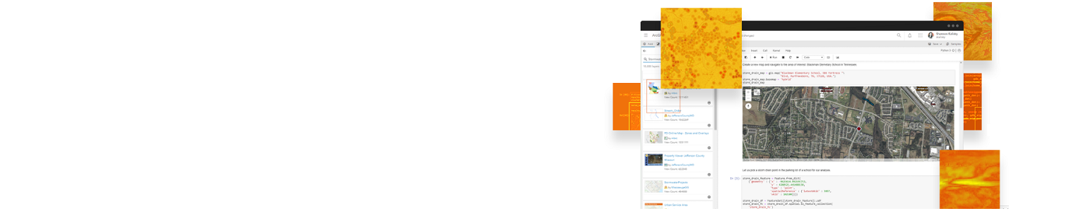 Web GIS 上の解析サービスの実行ができる他、Pandas、NumPy 等の Python ライブラリやPyTorch、TensorFlow、CNTK などのディープラーニング フレームワークとの連携により、高度なデータ解析機能を提供します。また、Jupyter Notebook 環境で対話的にチャートやマップを作成し、Python ノートブック形式で共有することが可能です。