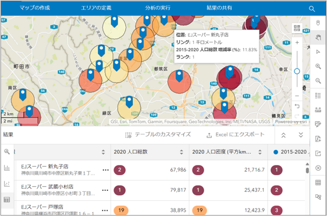 ArcGIS Business Analyst は、商圏分析・エリアマーケティングに特化したGIS ソリューションです。強力な解析機能に加え、国勢調査などの人口統計データや背景地図、住所データ、道路ネットワークデータが搭載されており、商圏分析や顧客分析などのエリアマーケティング業務を通じて、組織の意思決定を支援します。