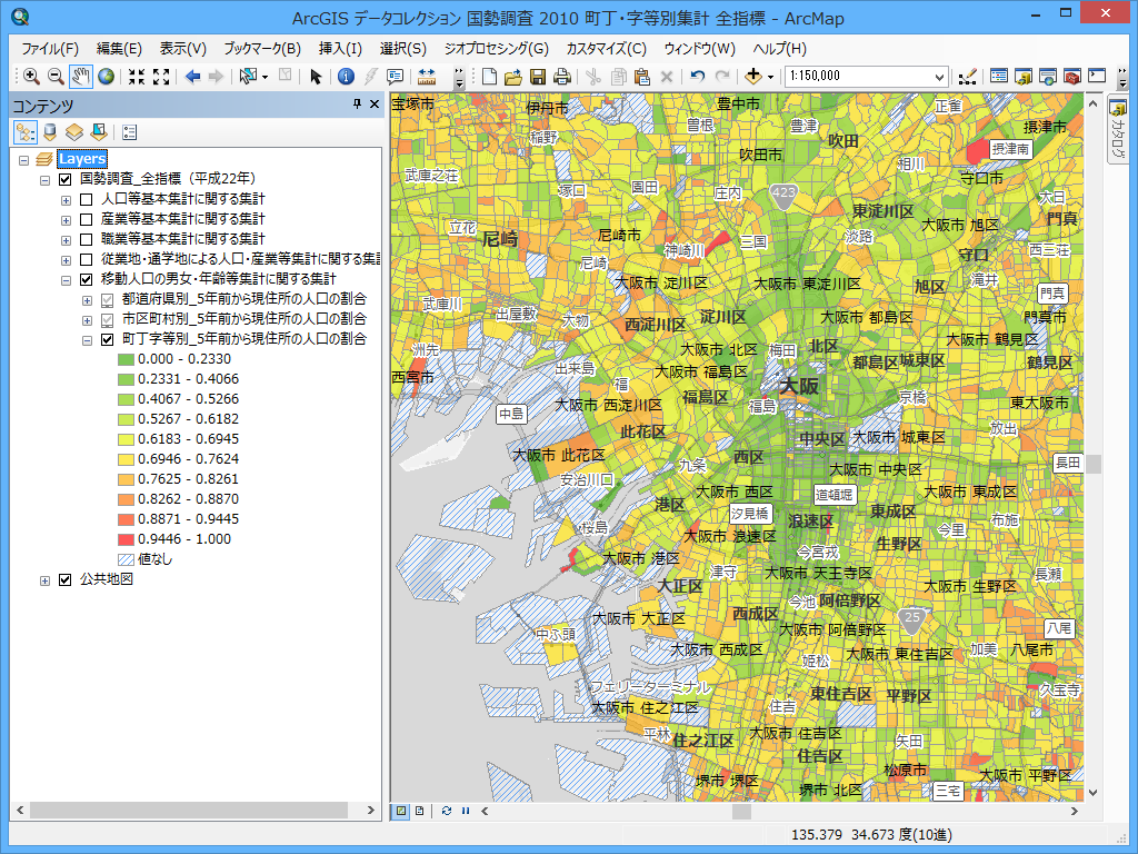 平成 22(2010)年国勢調査 町丁・字等別集計 全指標(682 指標)を収録した製品です。「スタンダードパック」に収録の基本指標と比べて、配偶関係や外国人人口など計 429 指標を追加収録しています。町丁・字等ポリゴンと統計表をあらかじめ結合し収録しているため、ArcGIS ですぐに統計解析を行うことができます。全国版と都道府県版をご用意しております。