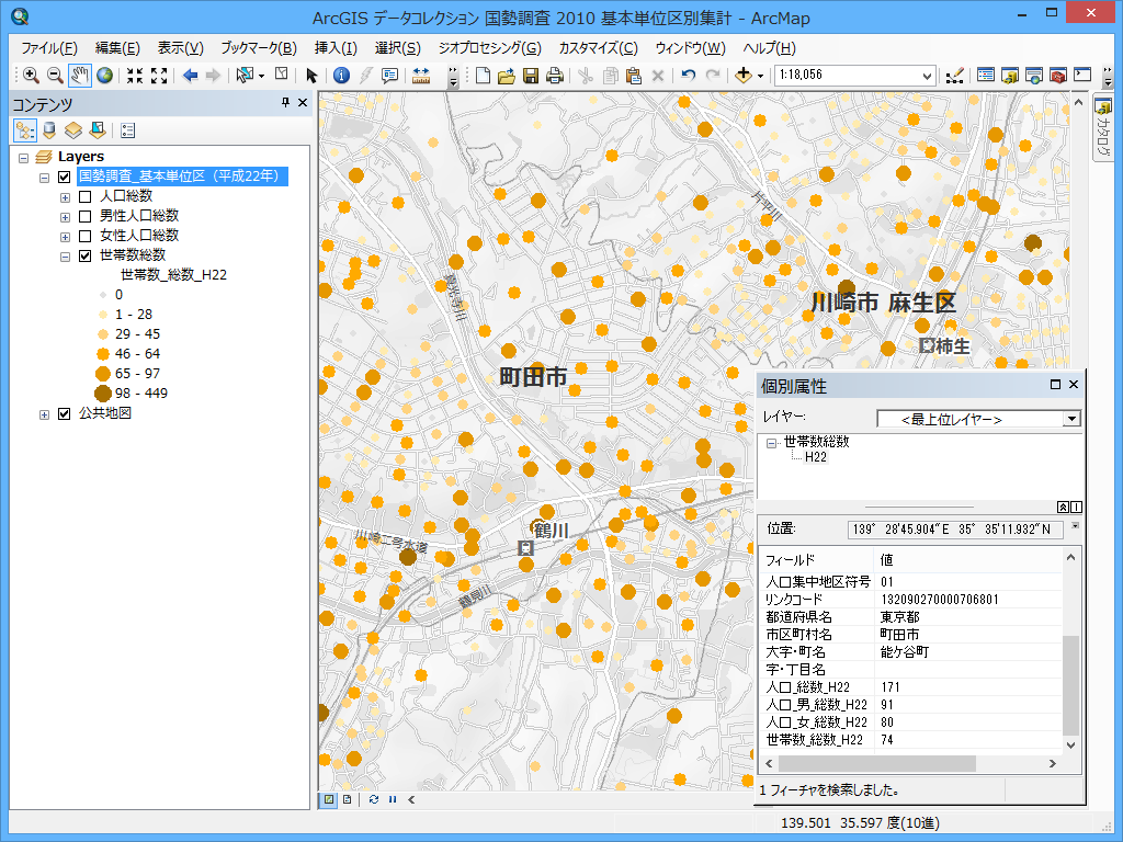 平成 22(2010)年国勢調査 基本単位区別集計全指標(4 指標)を収録した製品です。基本単位区は、街区もしくは街区に準じた小区画からなる、国勢調査結果の集計上の最小の地域単位で、町丁・字等別集計に比べて、さらに詳細な分析が可能です。町丁・字等の内部で、どのように人口が分布しているかを把握することができます。 あらかじめ加工したポイント データとして提供されるため、ArcGIS ですぐに統計解析を行うことができます。