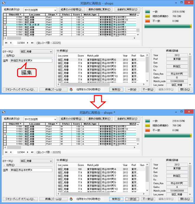 ジオコーディングの結果、住所データベースと不一致となった入力住所文字列を編集することで、住所データベースから一致する住所の候補を再検索することができます。