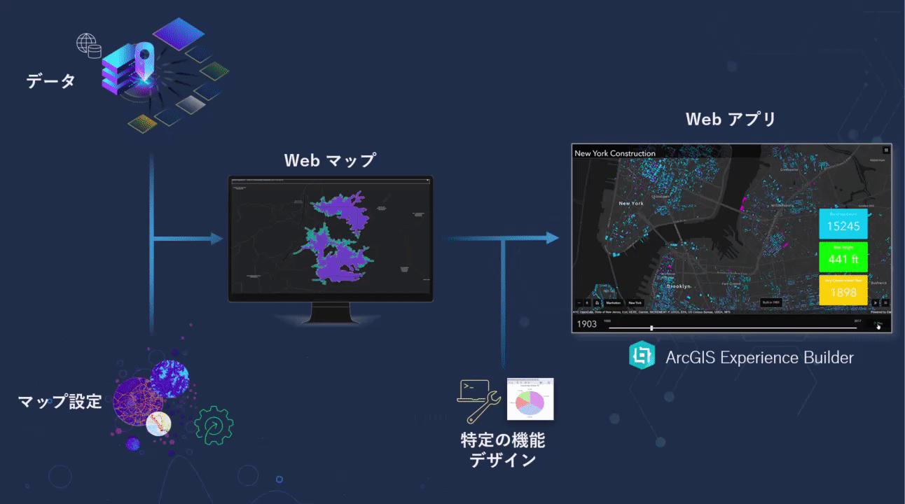 データの表現や設定が保存された Web マップに対し、ノーコードで機能やデザインを付加して Web アプリをすぐに作成できます。特定の機能やデザインで構成された Web アプリは、マップによる情報の伝達力を向上できます。