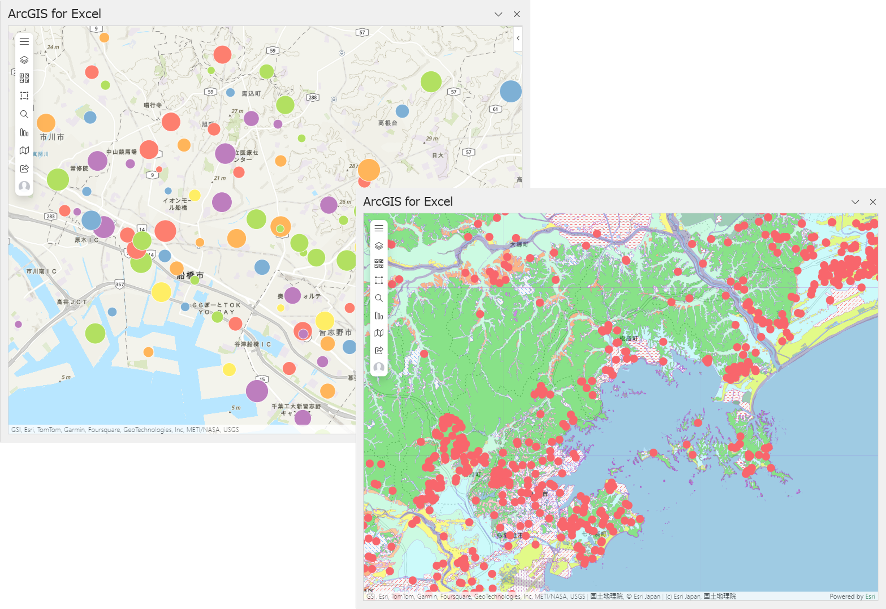 ArcGIS for Excel は、Microsoft Excel 上でデータをマップに可視化し、簡単な解析が行える ArcGIS のアドイン製品です。表やグラフだけでは把握しにくい地理的傾向を捉えることができます。