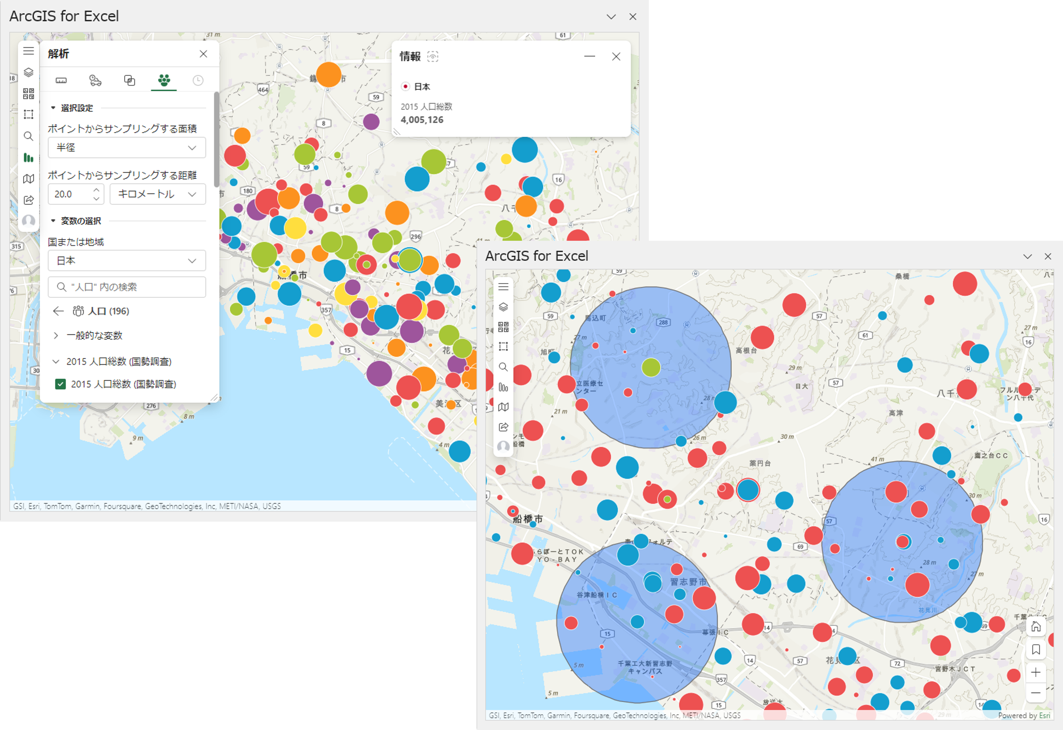Excel の関数に類似する、地理情報に関する ArcGIS の関数を利用できます。マップにデータを追加しなくても、Excel データの位置情報を変数として、住所の緯度経度の情報や、ある位置周辺の統計情報を Excel データに付与することができます。