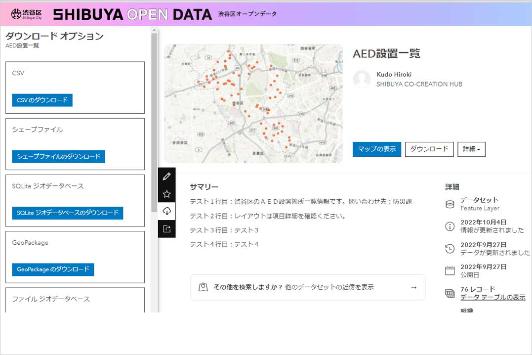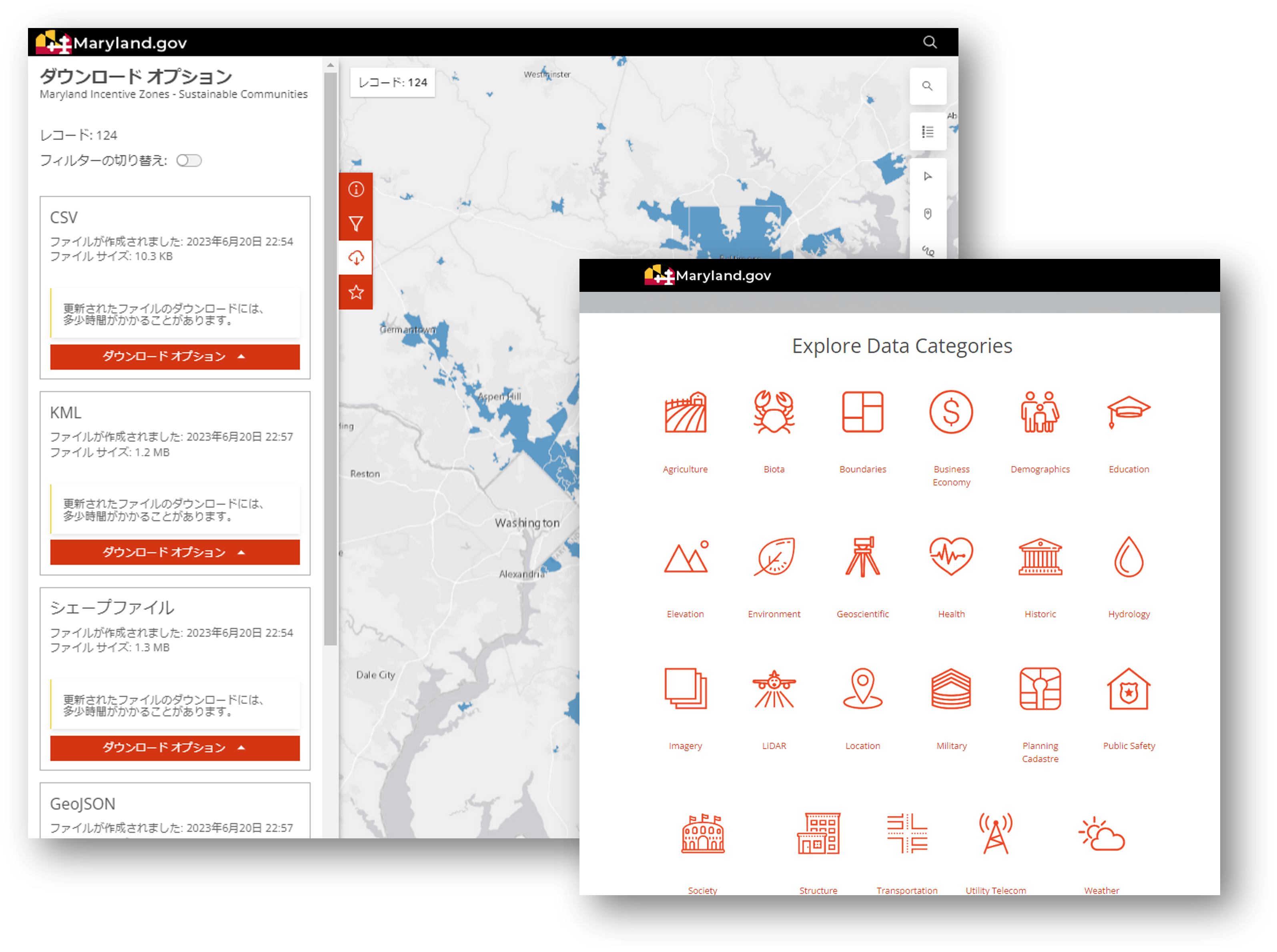 ArcGIS Hub では、オープンデータを検索ワードやカテゴリー別で検索・表示したり、CSV やシェープファイルとしてダウンロードする機能をコーディングすることなく構築することができます。また、他のアプリケーションなどから API を介してデータを利用することも可能です。