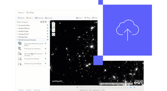 クラウド上で強力な画像解析、およびラスター分析のワークフローを使用して、画像を大規模に処理することができます。これにより、画像を使用して状況を把握し、洞察を得て、意思決定を支援することができます。