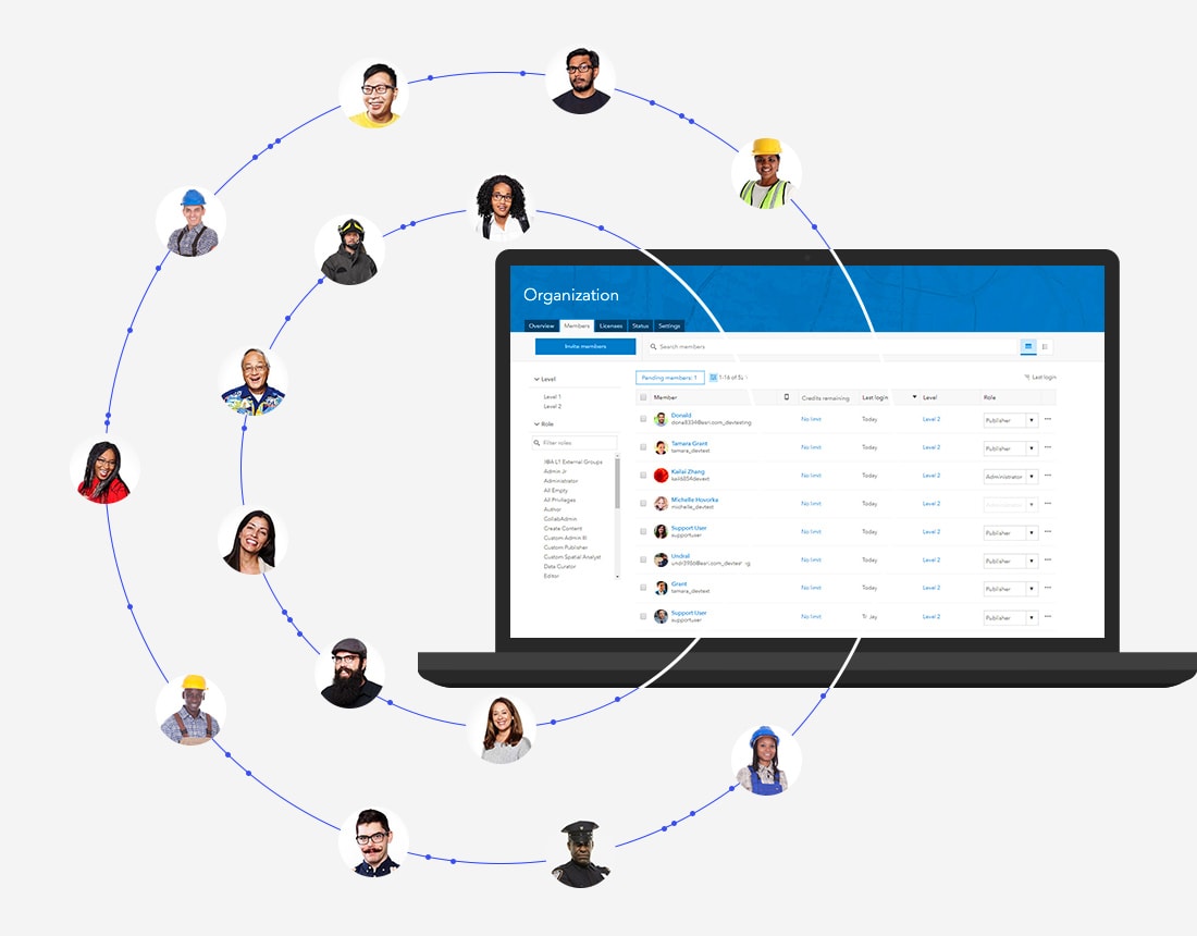 ArcGIS Online の管理ツールには、ユーザーやコンテンツの管理ために必要なものがすべて含まれています。たとえば、役割に応じて、権限をユーザーごとに割り当てたり、ライセンスとコンテンツを管理したり、システムの状態を確認、監視することができます。