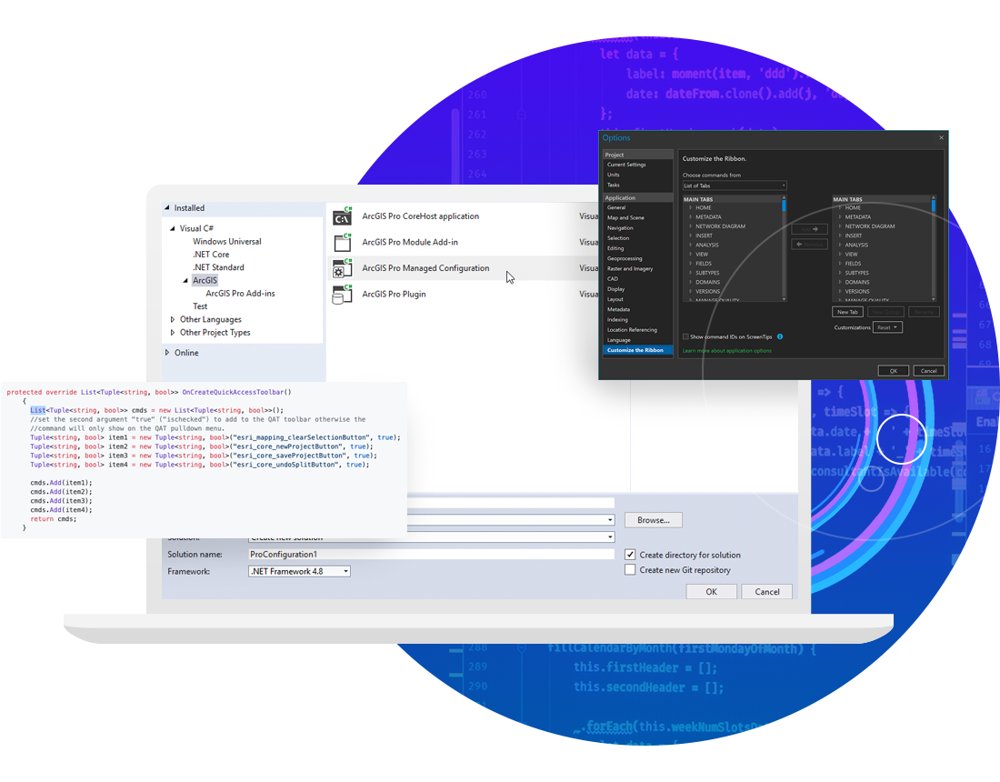 また、ArcGIS Pro SDK を使用して、独自のツールやワークフローで ArcGIS Pro を拡張できます。 Microsoft Visual Studio および ArcGIS Pro SDK for .NET を使用し、ArcGIS Pro アドインとソリューション構成を構築して、組織や業界に特有のカスタム機能を提供できます。