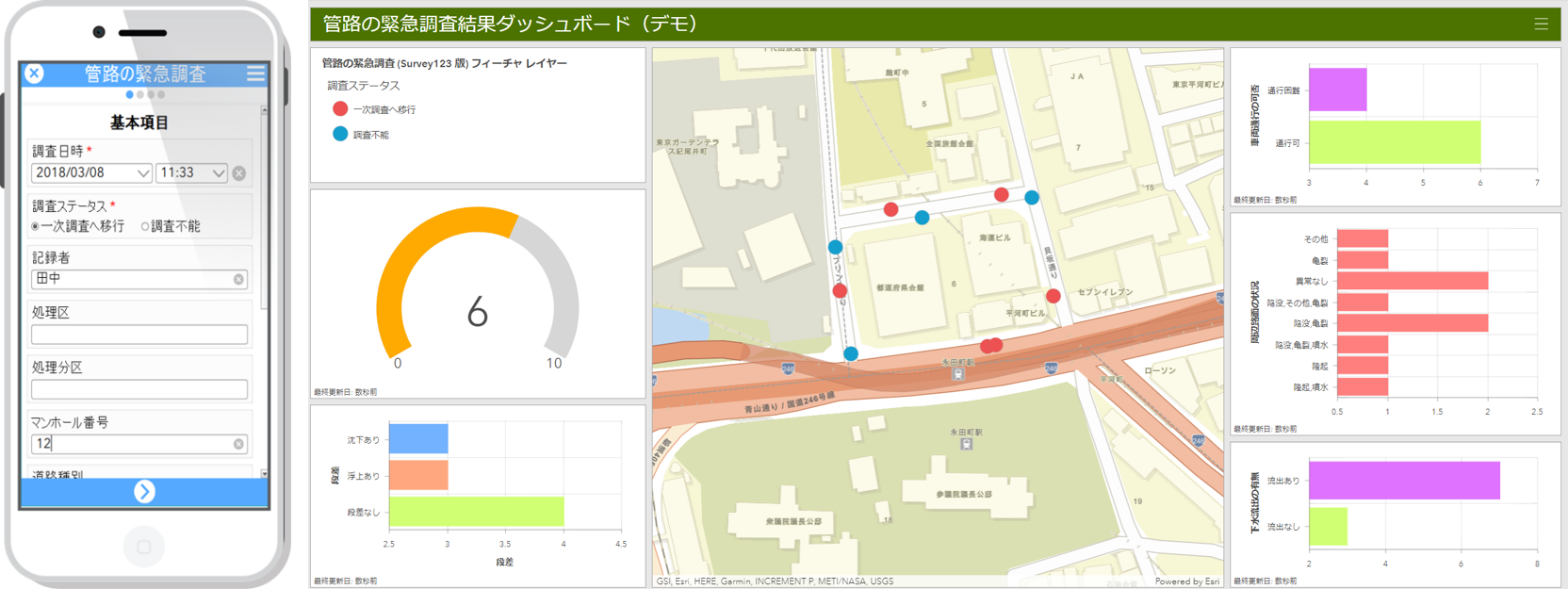 管路の緊急調査 (Survey123 版) テンプレートは ArcGIS ポータル (ArcGIS Online) を利用する現地調査ソリューションのテンプレートです。このテンプレートを利用することで、スマートフォンやタブレットなどのデバイスを用いて管路の緊急調査を行い情報を収集することができます。