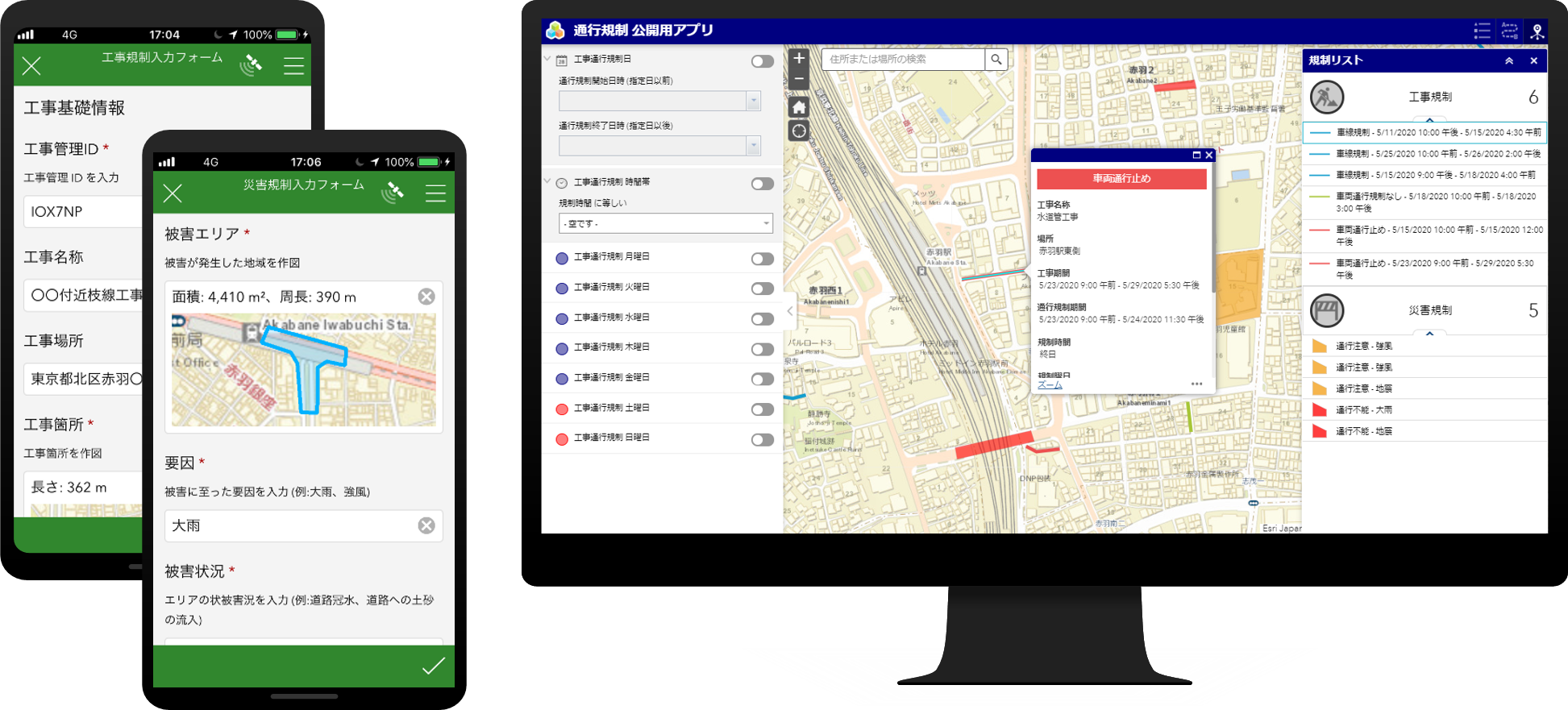 通行規制情報公開テンプレートは ArcGIS ポータル (ArcGIS Online) を利用する現地調査および情報公開ソリューションのテンプレートです。本テンプレートを利用することで、スマートフォンやタブレットなどのデバイスを用いて通行規制情報の入力を行い、市民や事業者に向けて通行規制が実施されている地域の情報を公開することができます。