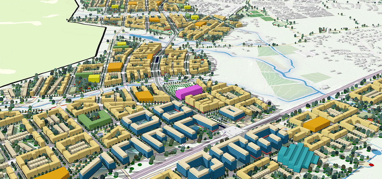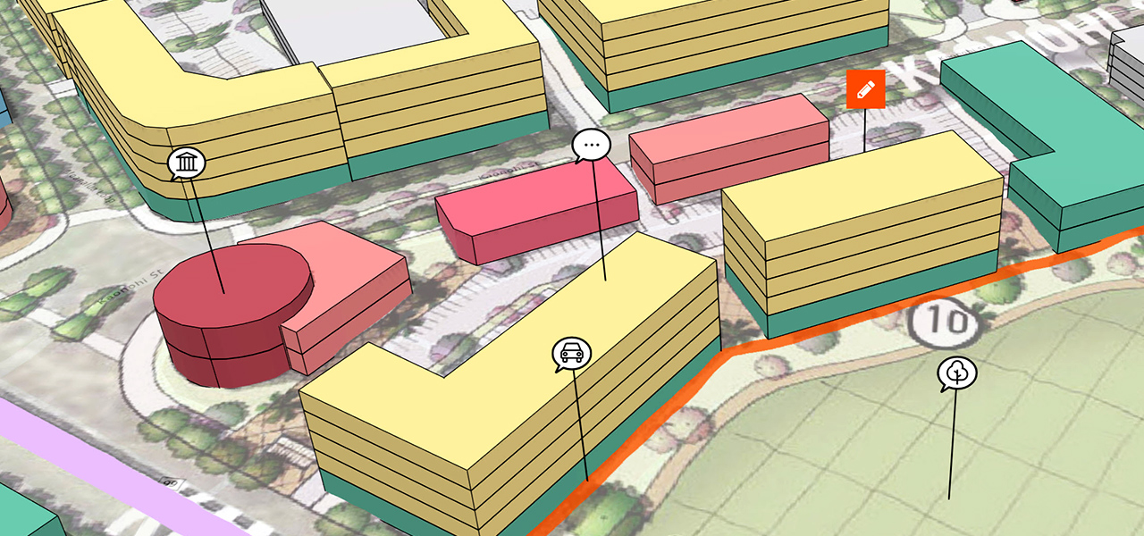 ArcGIS Urban で作成された詳細なゾーニング計画と 3D モデルは、プランナーが新しい都市地区の計画を視覚化して提示するのに役立っている。