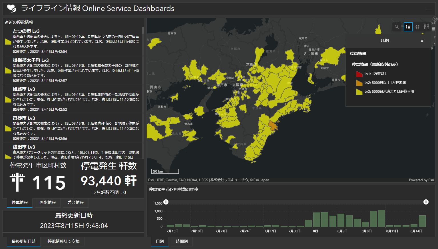 ライフライン情報オンラインサービスは、株式会社レスキューナウの危機管理情報センターが、24 時間 365 日有人体制で収集し提供する停電・断水・ガス供給停止などの情報を ArcGIS 上で可視化・解析可能な形式で配信します。リアルタイムなデータに加え、過去 1 カ月間における、毎正時の障害発生状況であるアーカイブ データも併せて提供するため、災害発生後の振り返り分析にも活用できます。