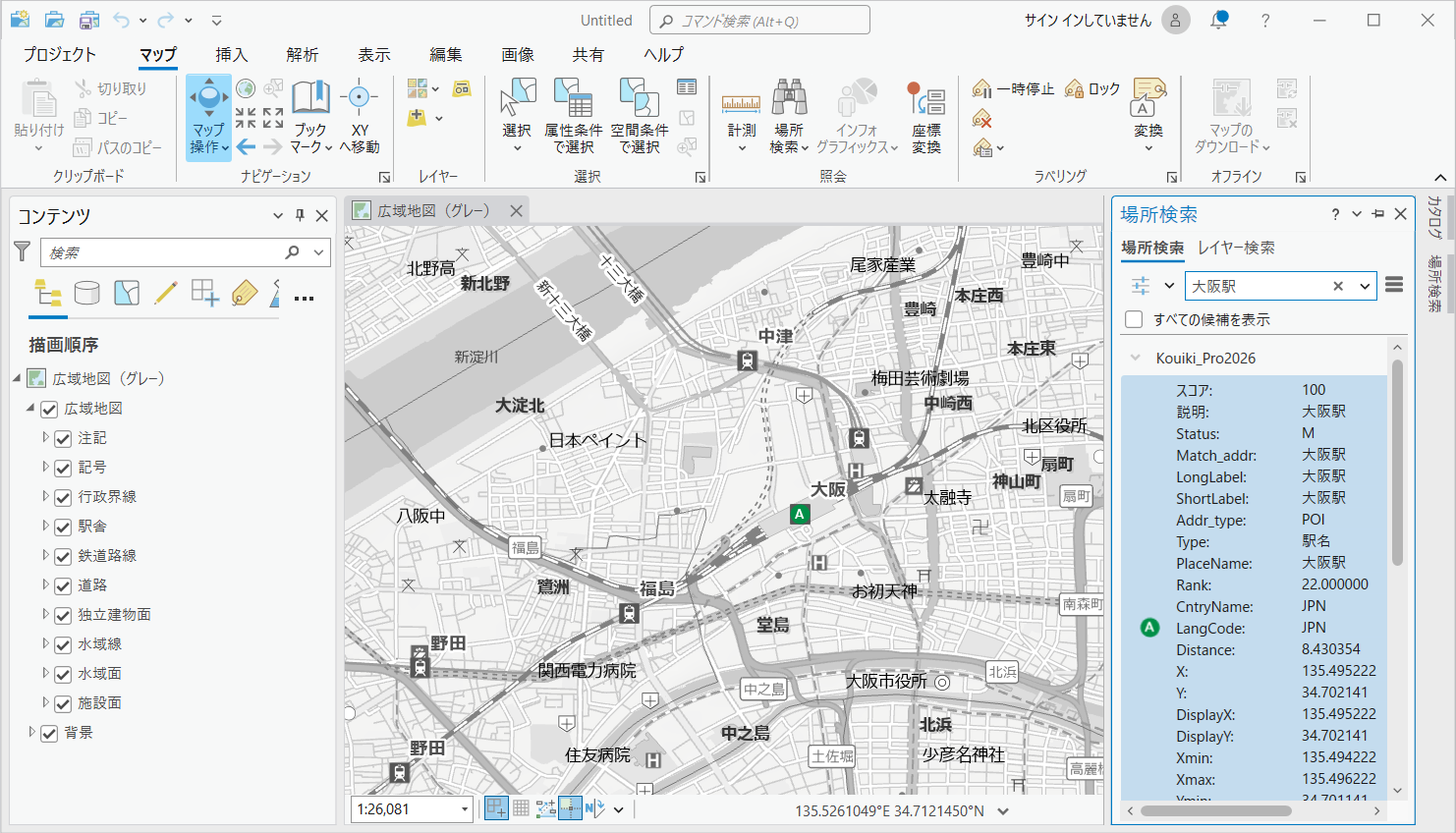 店舗や銀行などの民間のPOI(目標物)データを多数収録しています。また、POI ロケーターを収録しているため、ArcGIS 標準のジオコーディング ツールを使って、駅名、郵便番号、電話番号、交差点名、注記(小中縮尺)、施設名から目標物検索が可能です。
