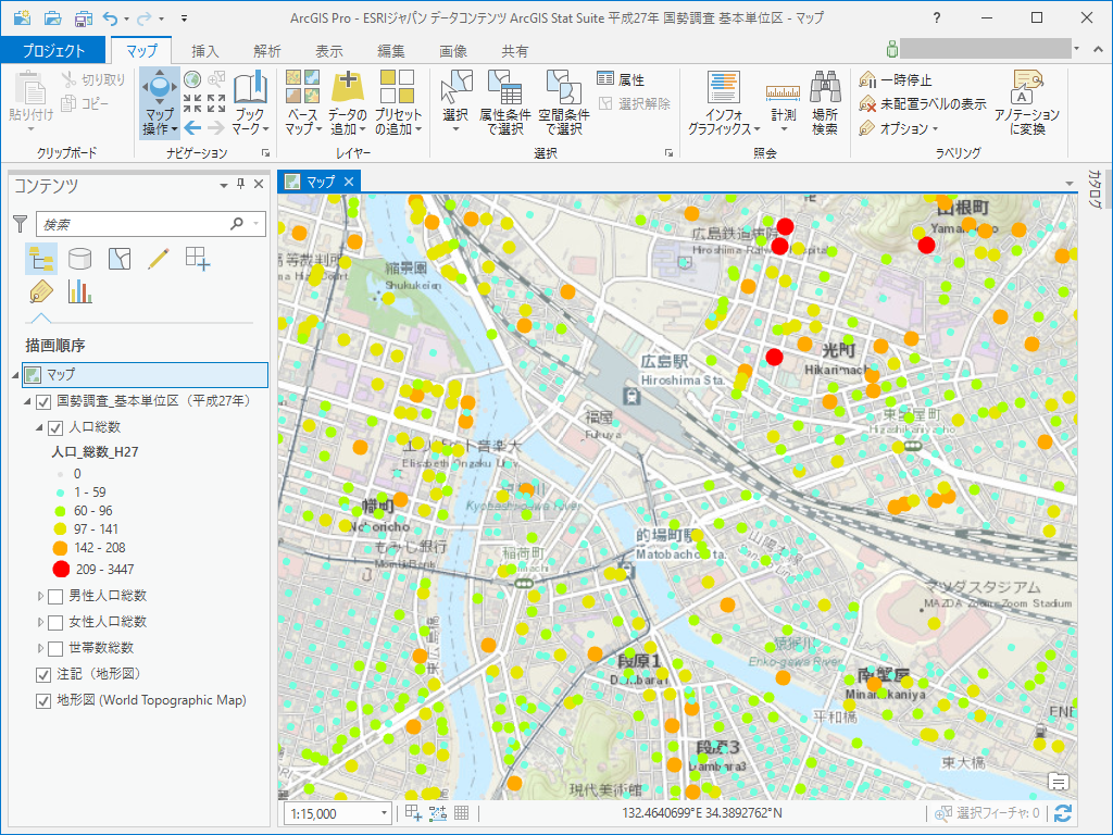 平成 27(2015)年国勢調査 基本単位区別集計全指標(4 指標)を収録した製品です。基本単位区は、街区もしくは街区に準じた小区画からなる、国勢調査結果の集計上の最小の地域単位で、町丁・字等別集計に比べて、さらに詳細な分析が可能です。町丁・字等の内部で、どのように人口が分布しているかを把握することができます。 あらかじめ加工したポイント データとして提供されるため、ArcGIS ですぐに統計解析を行うことができます。