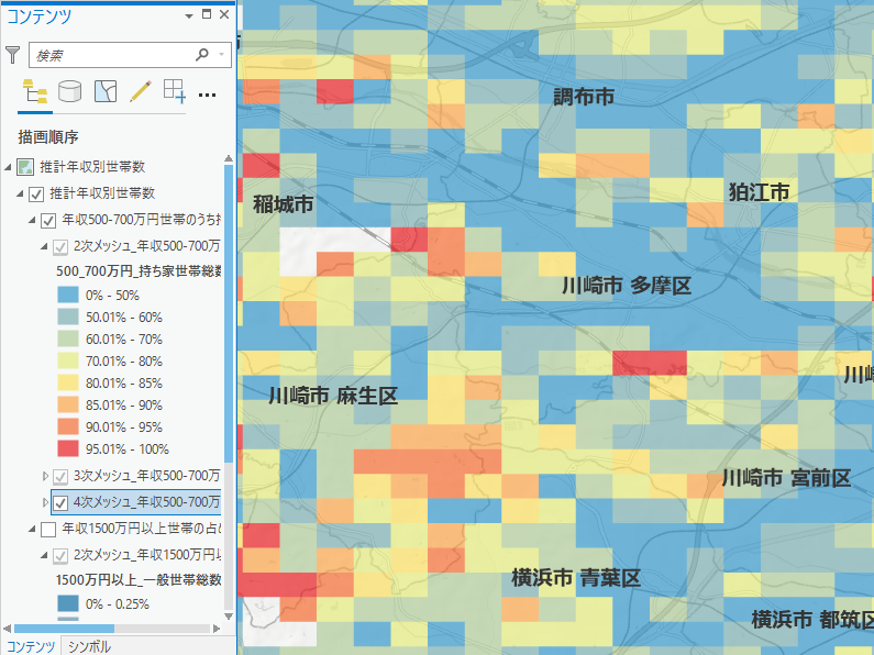 ポリゴンと推計指標はあらかじめ接合された状態で、ファイル ジオデータベース形式で 提供されるため、ArcGIS での解析等にすぐにご利用いただけます。また、主要な指標を色分けした便利なレイヤー ファイル も収録しており、すぐにマップ上での可視化にご活用いただけます。境界区分は町丁・字等別版とメッシュ版をご用意しております。