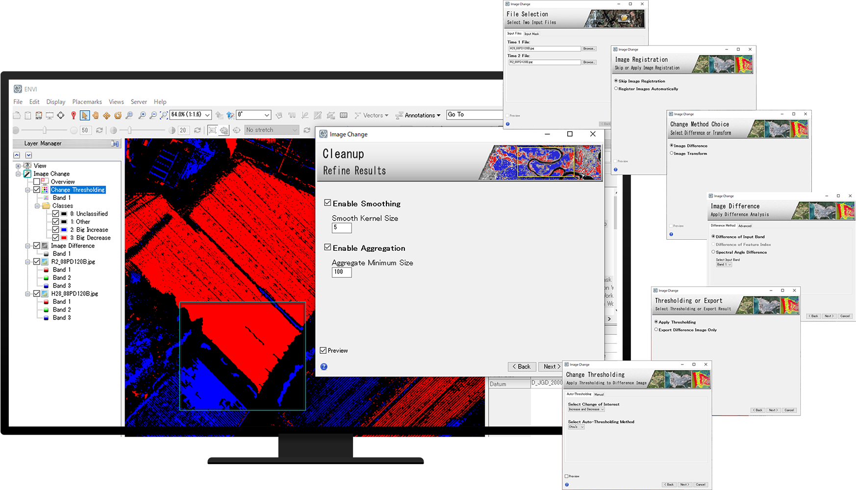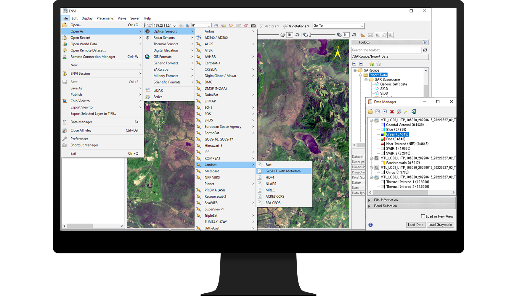 ENVI は、高度な機能をユーザーの視点に立った使いやすいインターフェースで提供する画像アナリスト・研究者のためのリモートセンシング用の画像解析ソフトウェアです。