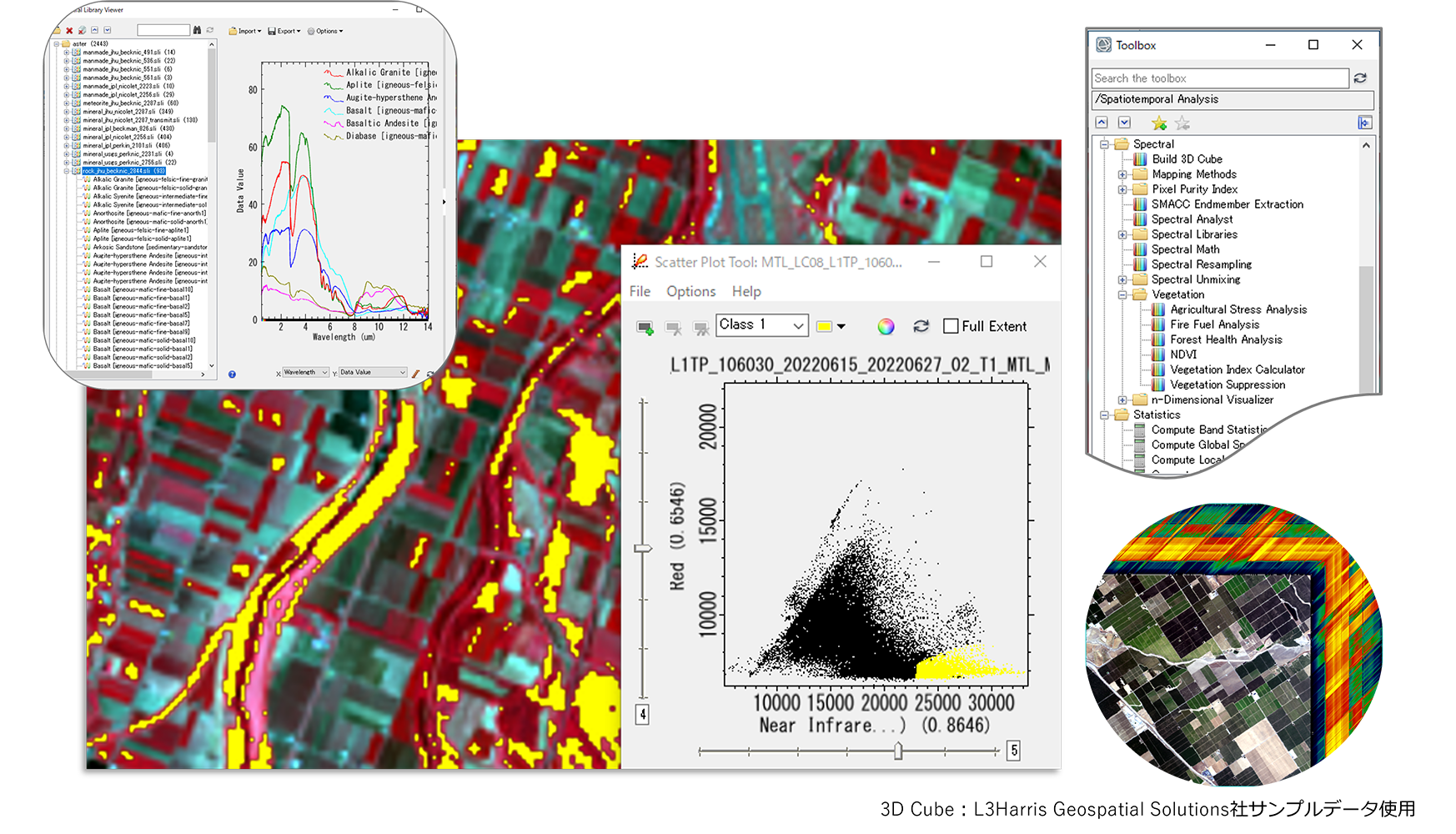 定評ある解析アルゴリズムや各種スペクトル ライブラリを用いてマルチスペクトル、ハイパースペクトルの分析を行うことが可能です。