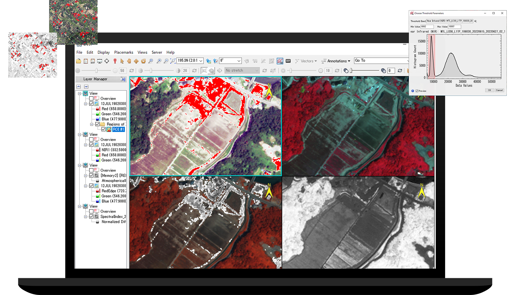 光学衛星、航空写真、SAR、LiDAR、ドローンなどの様々な種類のリモートセンシングデータをサポートし、標準機能でそれらデータの画像解析を行えます。