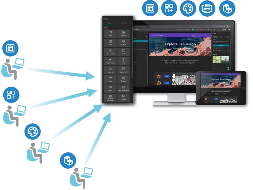 デザインや機能はベースとなる地図データから分離された疎結合なモジュールとして開発を行います。これにより、効率的に再利用可能なデザインと機能の開発を行うことができます。ArcGIS ポータルで管理している地図データを参照してすぐに利用できるため、モジュールのテストが容易です。