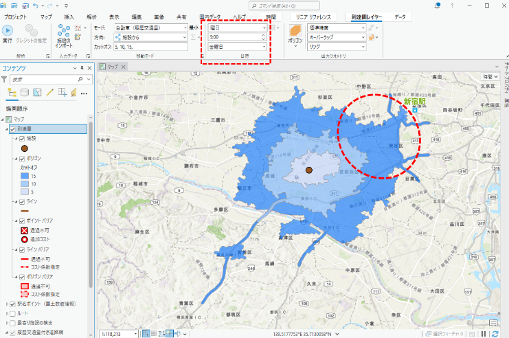 各道路の混雑パターンを考慮したより現実に近い道路ネットワーク解析の結果を得ることができます。