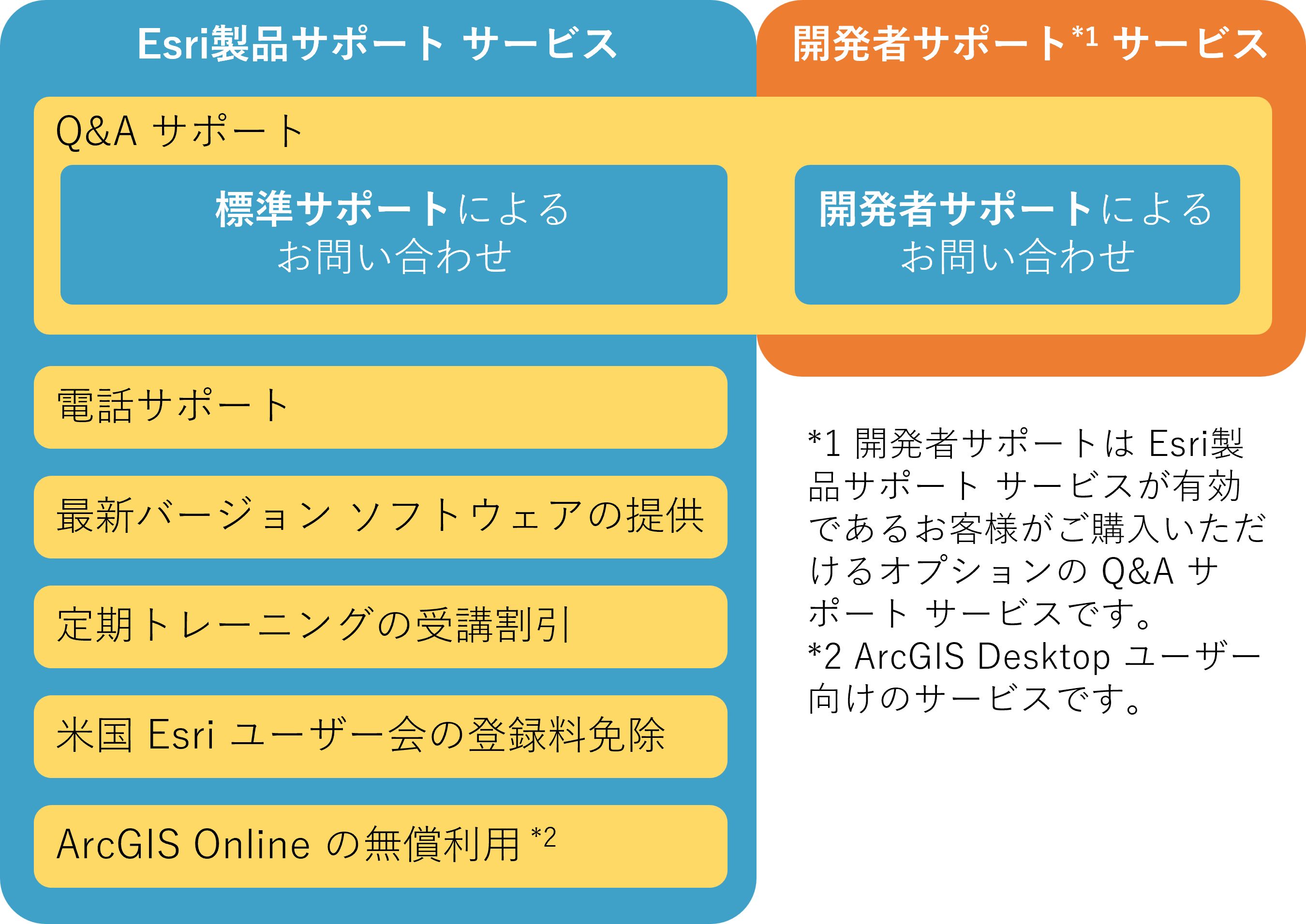 Q&Aサポートは、Esri 製品の操作方法、ご利用方法などに関するご質問に文面でお答えするサービスです。標準サポートでは、インストールや GUI の操作方法に関するご質問に回答いたします。開発 API に関するご質問は、オプションとして提供している開発者サポートから回答いたします。ご質問は、My Esri から受付いたします。